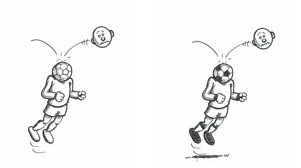 Tenslotte, een voorwerp of een personage zweeft nooit los in de lucht, althans, meestal niet, en als dat wel zo is hebben we hetzelfde volgende verschijnsel nodig (zie de vierde voetballer hierboven). Om een voorwerp enigszins in de omgeving te plaatsen, maken we vaak gebruik van de schaduw die iets of iemand op de grond veroorzaakt. Hiermee valt eigenlijk de hele tekening op zijn plek, worden onderlinge proporties duidelijk en zien we waar de grond precies is. Ook hier geldt de kracht van de suggestie: we hoeven niet de grond te tekenen, doch slechts de schaduw die op die grond valt. Niet altijd per sé nodig, maar het helpt erg in wat grotere tekeningen met meerdere elementen.